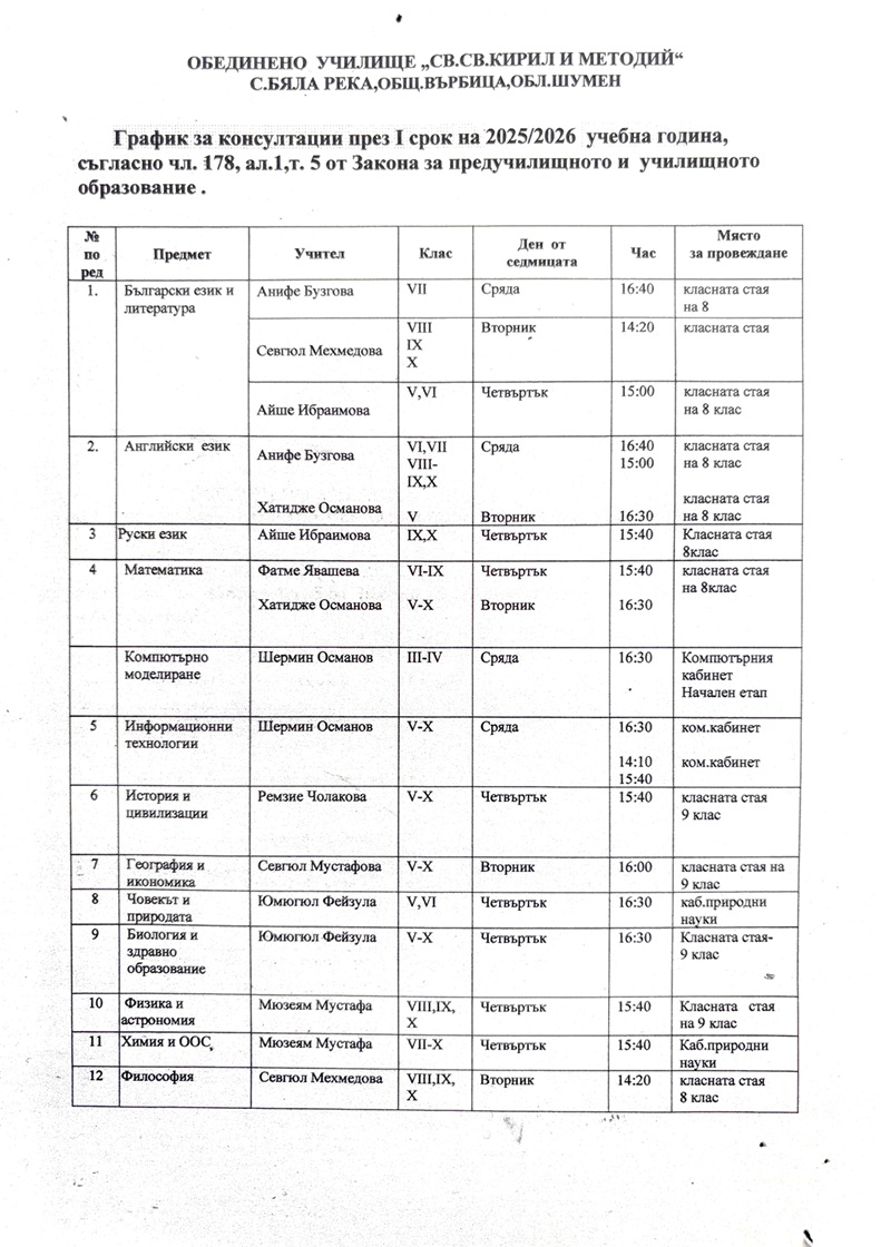 График за консултации на учителите през първи срок на учебната 2025/2026 г. График за консултации на учителите през втори срок на учебната 2025/2026 г. Как да премахнете тази реклама?