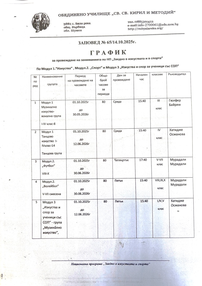 График за провеждане по Национална програма „Заедно в изкуствата и в спорта“ през учебната 2025/2026 година